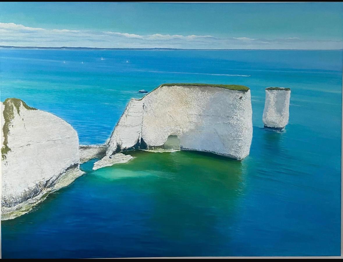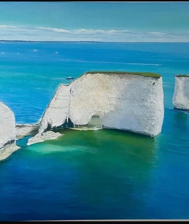 Old Harry Rocks is an original oil painting I created,presently displayed in Two For Joy gallery, Gosport. This painting is inspired by one of the most iconic landmarks on the Dorset coast. Standing at the edge of the cliffs and looking out toward those striking chalk formations, I was moved by the sheer presence of the landscape—the pale rock rising out of deep, shifting waters and the endless sky stretching above it. With textured brushwork and layered coastal tones, I aimed to capture both the rugged strength and the quiet beauty of this dramatic place.