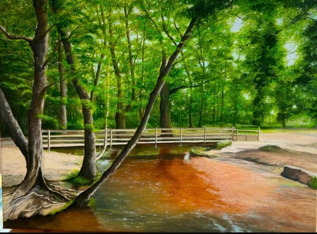Puttles Bridge, Brockenhurst is an original oil painting I created, inspired by the peaceful woodland paths of the New Forest. I wanted to capture the gentle flow of the stream, the reflections on the water, and the way the trees lean in as if protecting a quiet moment of stillness. With textured brushwork and natural, earthy tones, I aimed to create a sense of calm and connection to the landscape—an invitation to pause and breathe in the quiet magic of the woods.