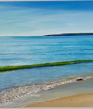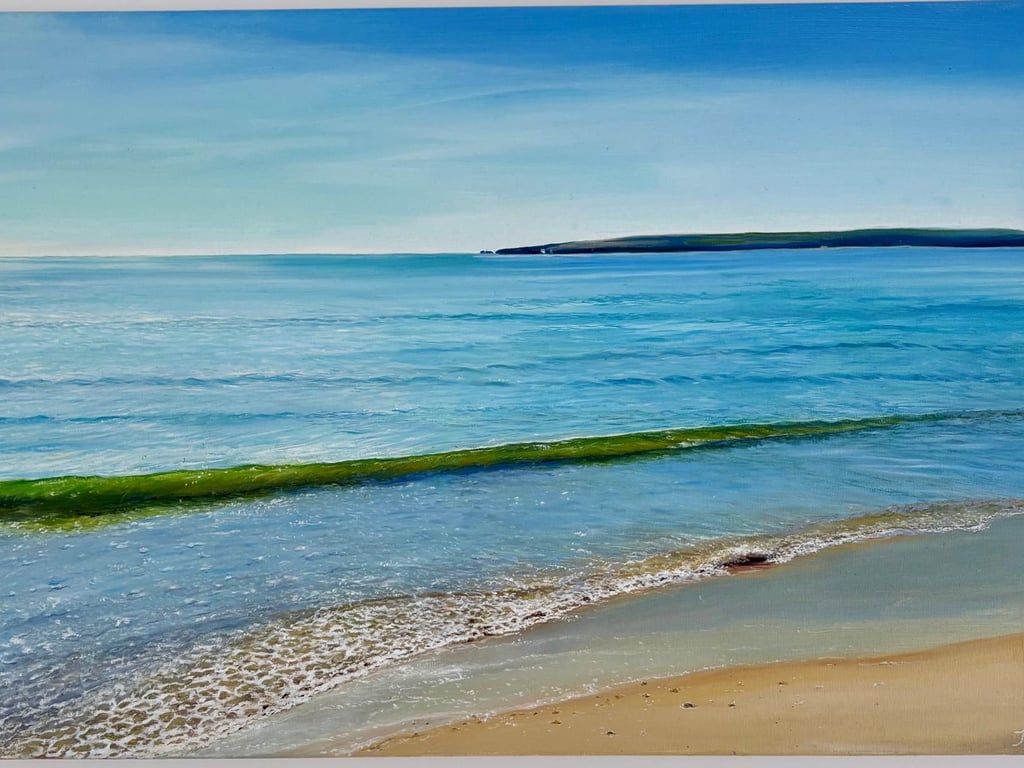 Sandbanks Beach is an original oil painting inspired by one of Dorset’s most beautiful stretches of coastline. I wanted to capture the feeling of standing at the water’s edge as the tide moves in—soft sand underfoot, clear open water, and the gentle sea breeze. In the background, the iconic Old Harry’s Rock rises from the sea, adding a timeless landmark to the serene coastal scene.