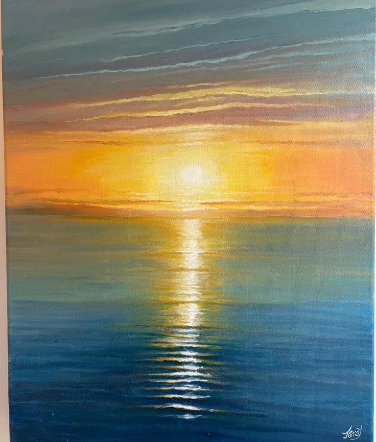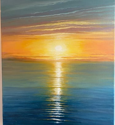 Sunset Over Sea is an original oil painting I created to capture that breathtaking moment when the sun sinks toward the horizon and the whole sky becomes a wash of colour over the water. I was inspired by the way warm tones melt into cooler shades across the sea’s surface, creating a sense of calm and reflection. With layered brushwork and soft, glowing transitions of colour, I aimed to express the peaceful stillness that settles in at the end of the day.