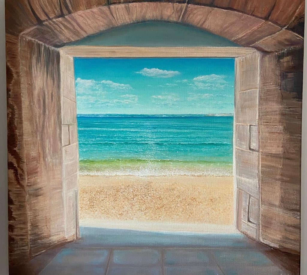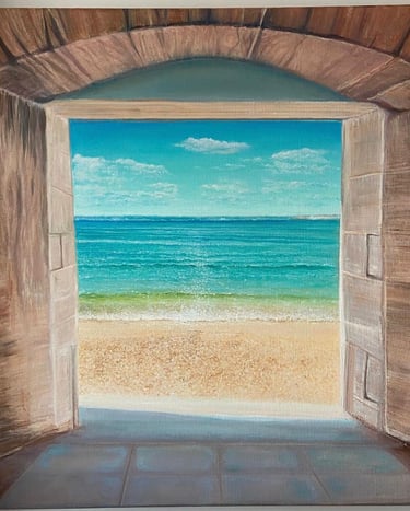 Through The Arch is a commissioned oil painting I created from a client’s photograph, capturing a beautiful view of the beach and water as seen from inside an arched window. The reference image had a quiet, intimate atmosphere—almost as if you were standing in a cool stone passageway, looking out at sunlight dancing on the shoreline. I wanted to preserve that feeling in paint, using layered brushwork to echo the textures of the arch while allowing the distant sea and sky to open the scene into a sense of space and freedom.